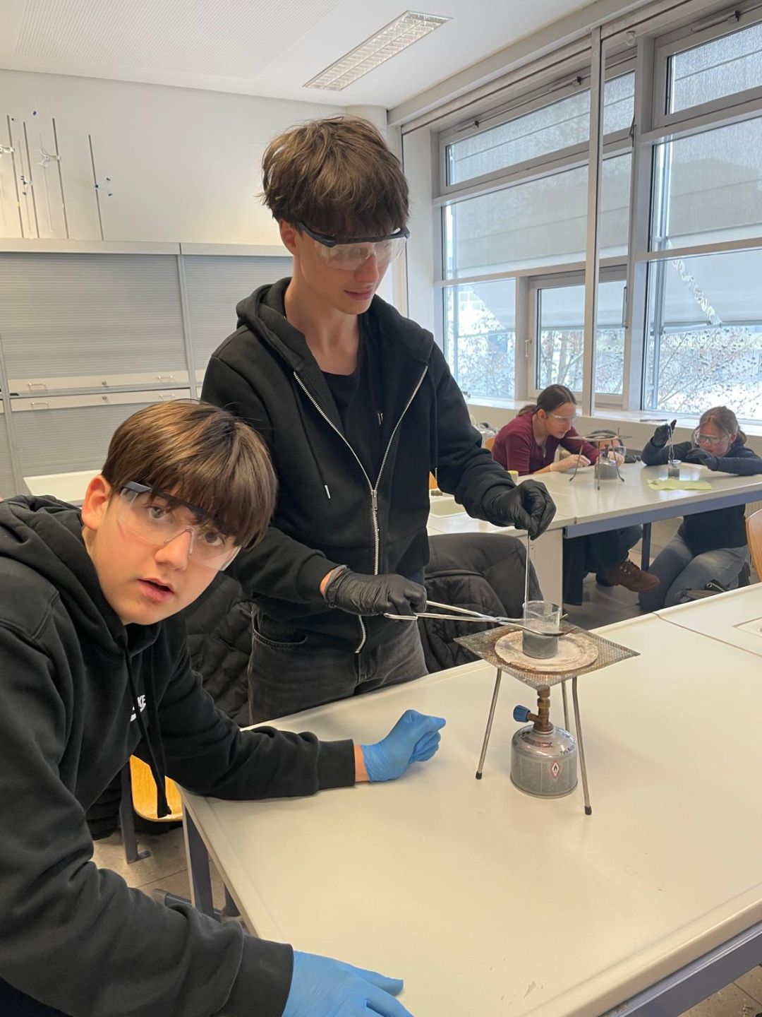 Gleich nach den Weihnachtsferien zu Jahresbeginn 2026 durfte die 4A Kupfermünzen im Chemieunterricht „vergolden“. Genauer gesagt wurde eine Messing Legierung aus Kupfer und Zink an der Oberfläche der 5 Cent oder 2 Cent Münzen hergestellt. Das Protokoll für dieses Experiment ist anspruchsvoll und verlangt große Disziplin und Vorsicht von den SchülerInnen. Es wird mit Salzsäure, starker Kalilauge und Feuer gearbeitet. Außerdem erfolgt die Entsorgung der Lösung über den Schwermetallabfall und nicht in der Spüle. Alle gefährlichen Schritte mit Salzsäure wurden von der Lehrkraft unter dem Abzug durchgeführt. Jedoch das Kochen und Brennen der Legierung durften die SchülerInnen selbstständig auf ihrem Laborplatz durchführen. Das Tragen von Schutzbrillen und teilweise auch Handschuhen wurde sehr diszipliniert eingehalten.