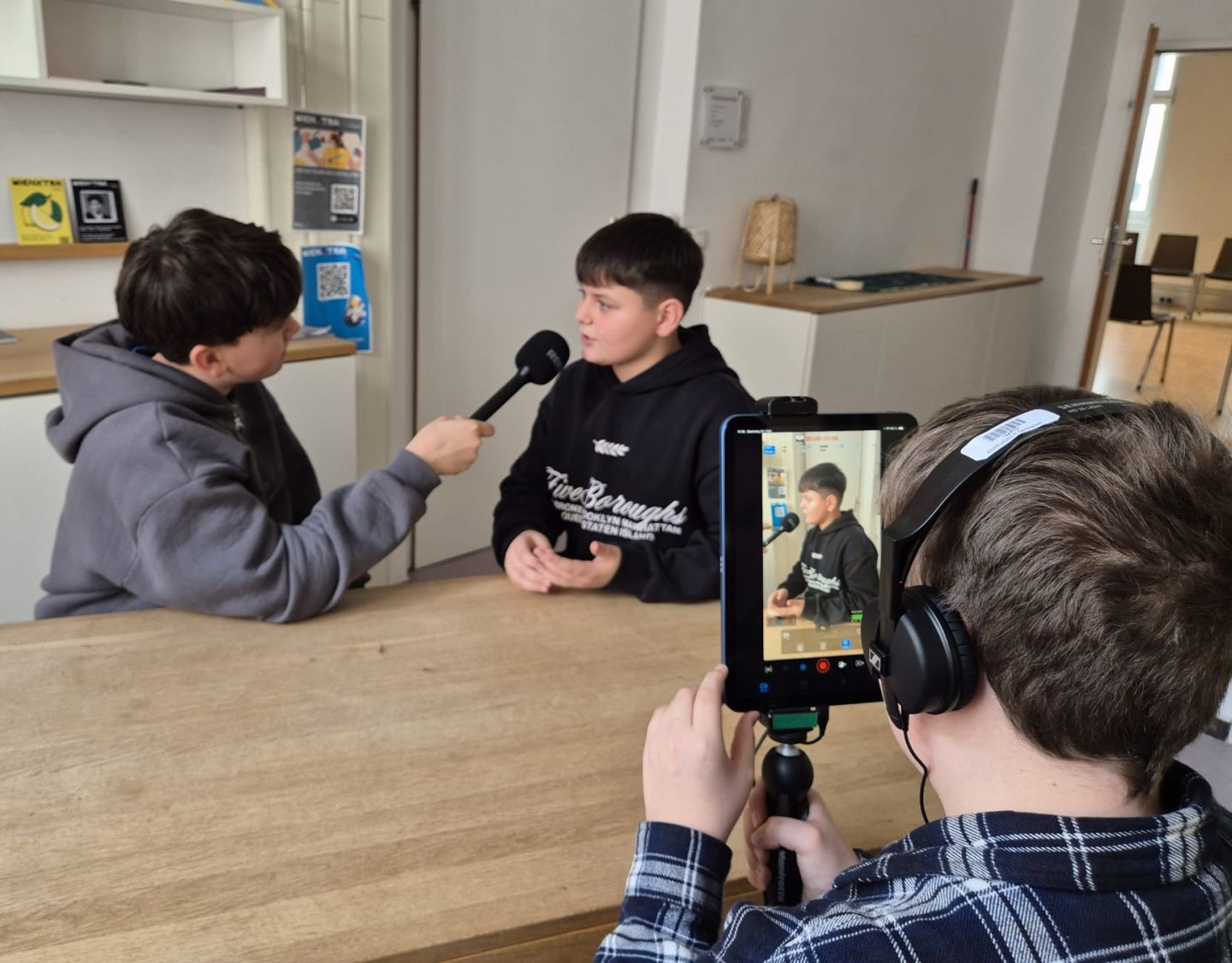 Damit für die praktische Umsetzung vor Ort genügend Zeit blieb, wurden die Beiträge der Schülerinnen und Schüler bereits im Deutschunterricht sorgfältig vorbereitet. Ausgestattet mit iPads, Mikrofonen und Kopfhörern machten sich die Kleingruppen im und rund um das Medienzentrum ans Werk. So entstanden Interviews, Straßenumfragen und kreative Erklärvideos, die nach dem Dreh geschnitten, vertont und schließlich der Klasse präsentiert wurden.
