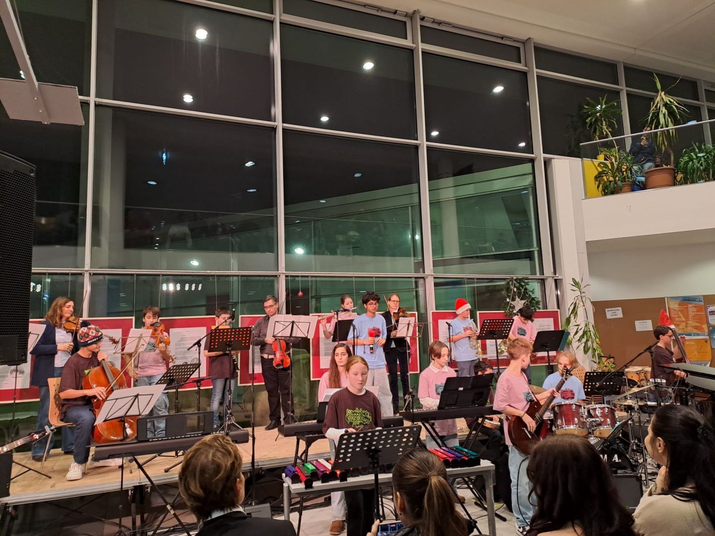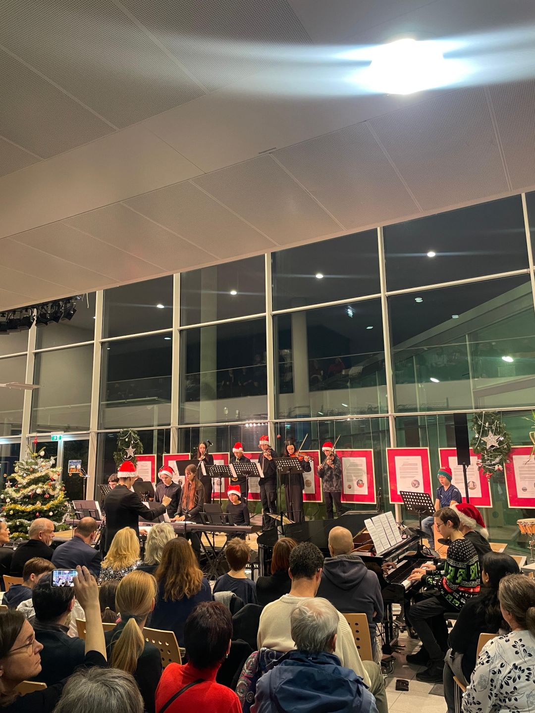 Am 18. Dezember fand das Weihnachtskonzert der Musikklassen und ihrer Gäste statt. Die Aula war bis auf den letzten Platz gefüllt und die Besucherinnen und Besucher erwartete ein abwechslungsreiches, buntes Programm. Mit Musik, Gesang und festlicher Stimmung sorgten die Schülerinnen und Schüler für einen stimmungsvollen Abend.