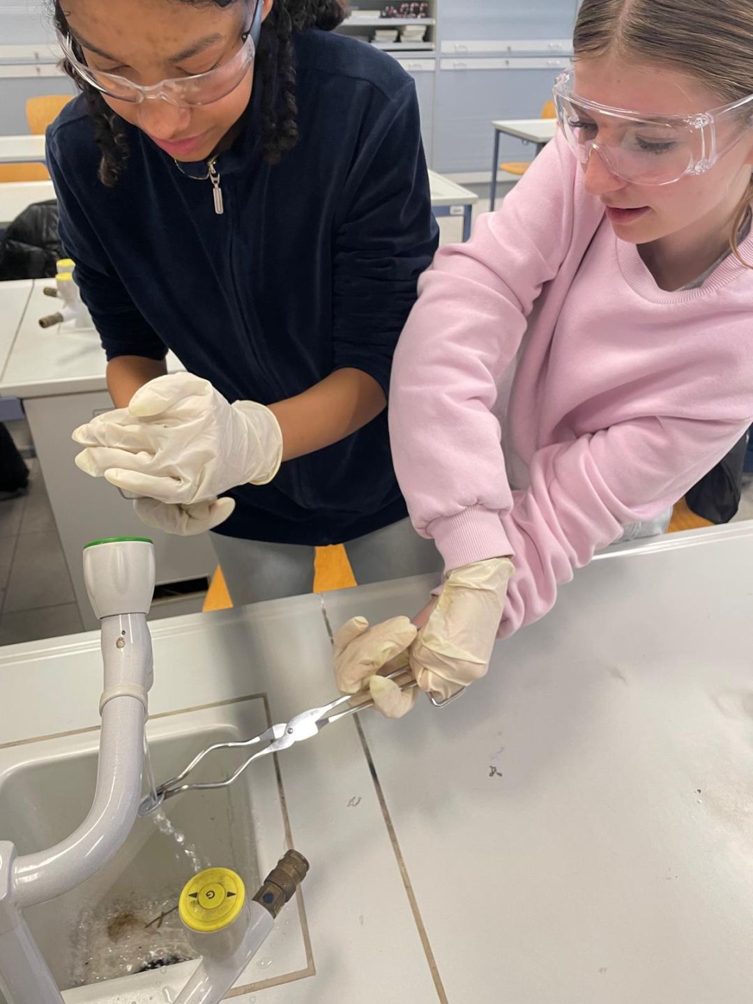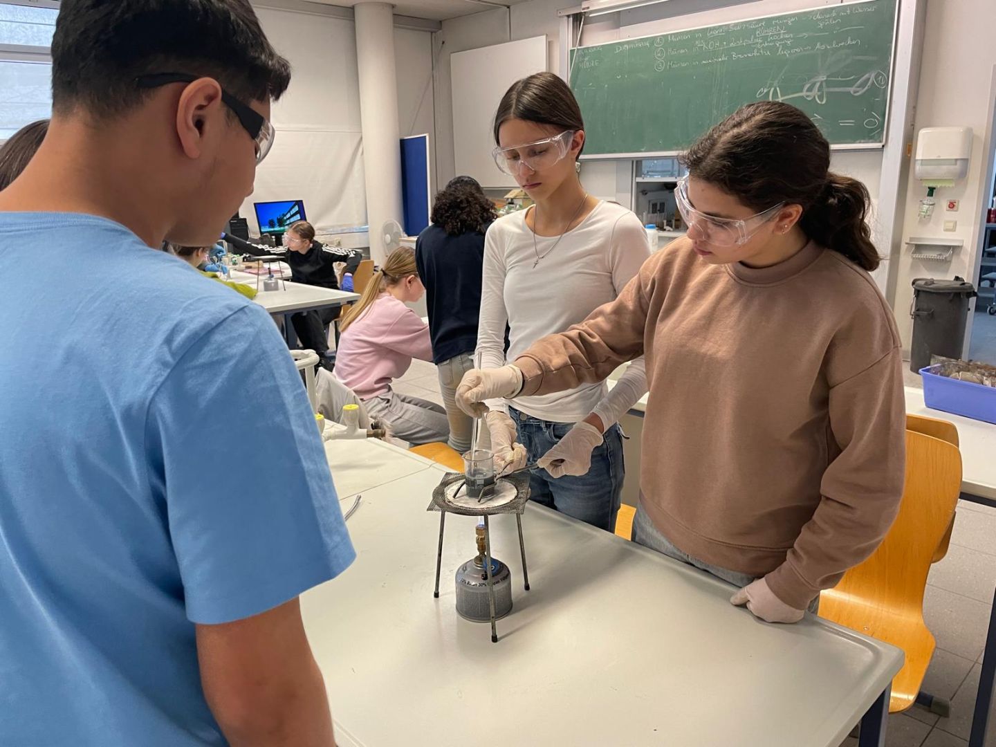 Gleich nach den Weihnachtsferien zu Jahresbeginn 2026 durfte die 4A Kupfermünzen im Chemieunterricht „vergolden“. Genauer gesagt wurde eine Messing Legierung aus Kupfer und Zink an der Oberfläche der 5 Cent oder 2 Cent Münzen hergestellt. Das Protokoll für dieses Experiment ist anspruchsvoll und verlangt große Disziplin und Vorsicht von den SchülerInnen. Es wird mit Salzsäure, starker Kalilauge und Feuer gearbeitet. Außerdem erfolgt die Entsorgung der Lösung über den Schwermetallabfall und nicht in der Spüle. Alle gefährlichen Schritte mit Salzsäure wurden von der Lehrkraft unter dem Abzug durchgeführt. Jedoch das Kochen und Brennen der Legierung durften die SchülerInnen selbstständig auf ihrem Laborplatz durchführen. Das Tragen von Schutzbrillen und teilweise auch Handschuhen wurde sehr diszipliniert eingehalten.