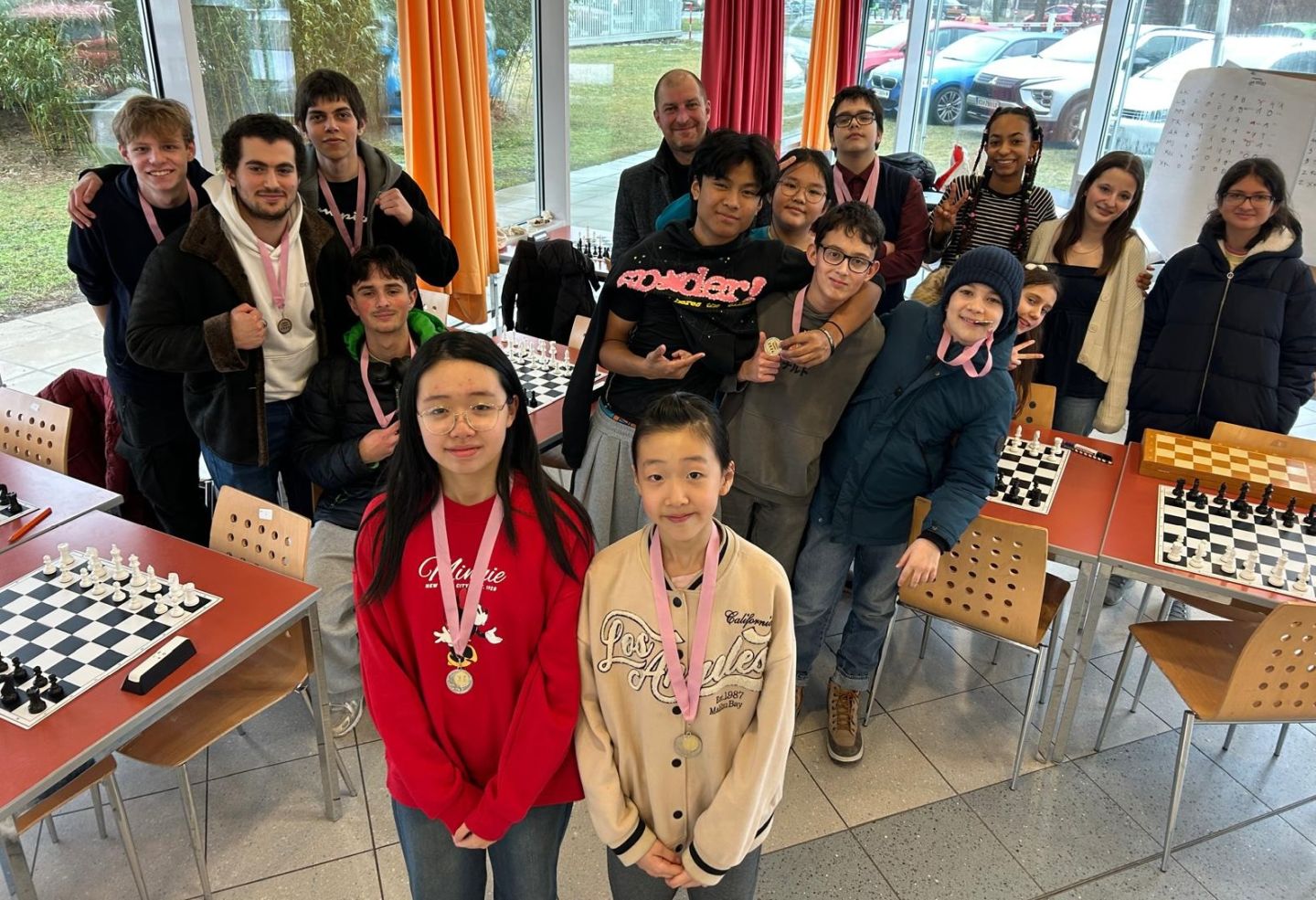 Nach vierzehn Runden, jeder zweimal gegen jeden, standen die Gewinner fest: Die Teilnehmerinnen und Teilnehmer der der unverbindlichen Übung Schach aus der Unterstufe hatten sich gegen die Favoriten aus der Oberstufe durchgesetzt und erhielten entsprechende Medaillen edlen Metalls.