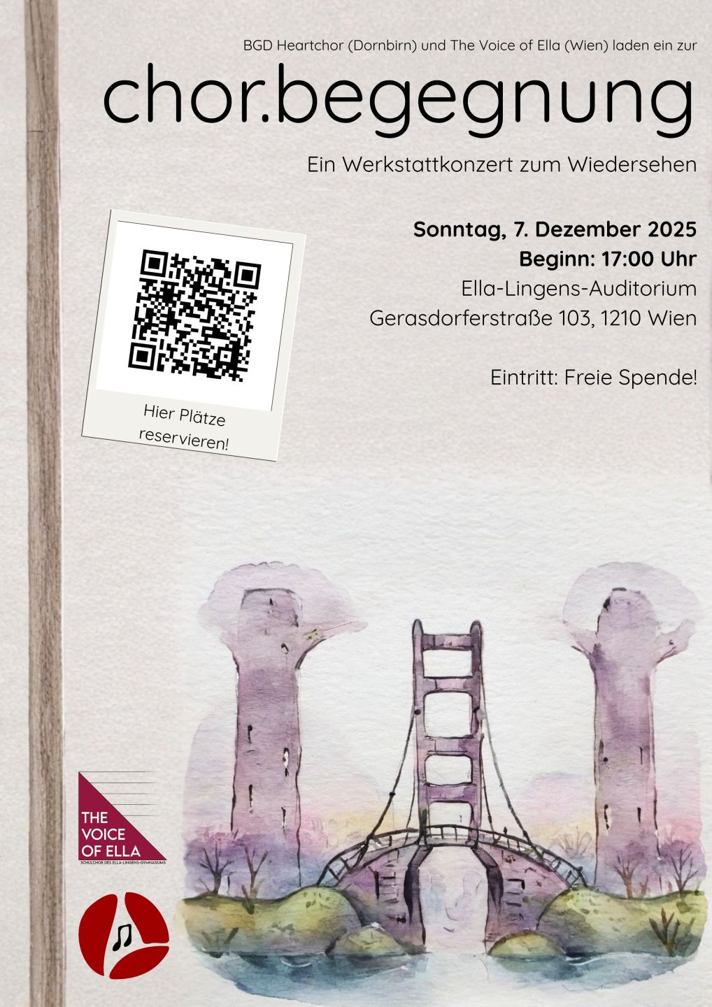 im Juni war THE VOICE OF ELLA in einem schuljahresübergreifenden Projekt zu Gast beim BGD HeartChor in Dornbirn, bei dem wir herzlich empfangen, versorgt und unterhalten wurden. In der stillsten Zeit des Jahres gibt es nun den Gegenbesuch unseres Vorarlberger Partnerchores in Wien. Im Rahmen dieses Gegenbesuchs laden wir herzlich ein, die beiden Chöre "in concert“ zu hören.